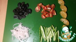 Маслины режем пополам, помидоры - на четвертинки, огурец - соломкой, лук - полукольцами и маринуем его в яблочном уксусе. Дольки мандарина чистим от пленок.