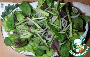 На блюдо выкладываем вымытые и высушенные листья салата, маринованный лук и огурец.
