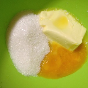Смешаем размягченное масло с сахаром и двумя желтками.