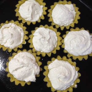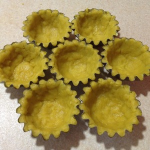 Распределяем ровным слоем тесто в формочках (предварительно смазанных маслом ) формируя корзинки.
