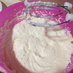 Хорошо взобьем все миксером и по чуть-чуть просеиваем в муку продолжая взбивать массу.