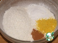 Смешать в отдельной миске муку, разрыхлитель, кокосовую стружку, 1 ч. л. корицы и лимонную цедру. |