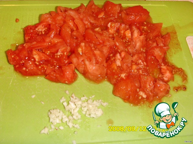 Помидоры очистить от кожуры, нарезать, также нарезать мелко чеснок.