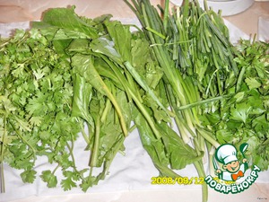 Чем больше зелени, тем лучше. Очищенную зелень разрезаем (пучок) на 3 части (не обязательно мелко).