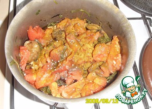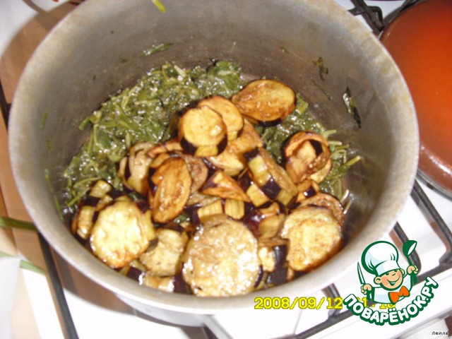 После обжарить баклажаны. Как видно на фото, зелень уварилась. Добавляем баклажаны.