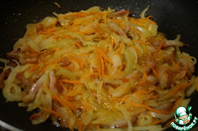 В сковороде Вок или глубоком сотейнике обжарить бекон и спасеровать лук с морковью.