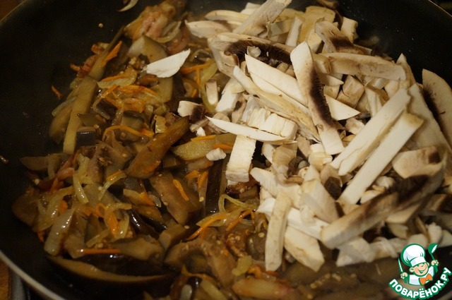Добавить баклажаны и обжаривать в течении 7 минут, затем добавить шампиньоны и обжарить еще 5 минут.