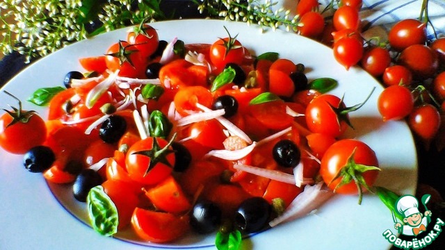 3. Равномерно распределите маслины, каперсы и базилик среди помидоров.