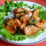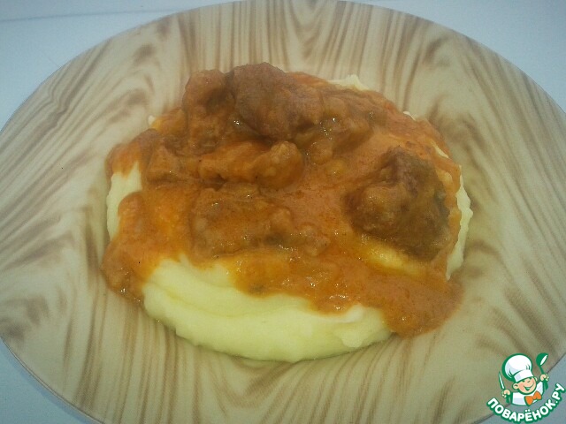 Помещаем мясо в кастрюлю с соусом и на медленном огне тушим 20-30 минут (зависит от качества мяса). Не забываем мешать.
