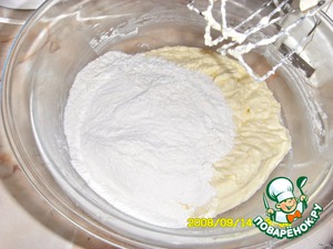 • Муку смешать с разрыхлителем, после добавить в общую массу.