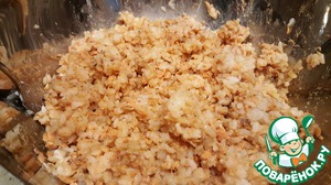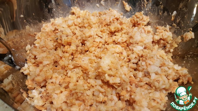 Пока тесто вымешивается, сделать начинку. Отварить рис до готовности, остудить. Размять вилкой консервированную рыбу. Отварить, почистить и нарезать яйца. Если нужно добавить соевый соус.