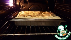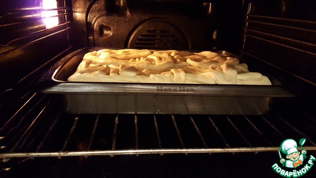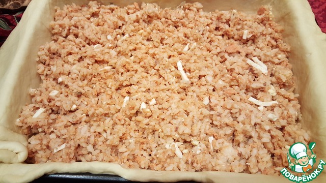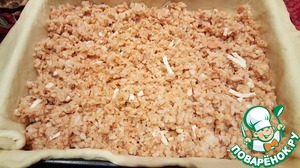 Первую часть теста раскатать по размеру формы с учётом бортиков. Перенести тесто в форму. Выложить сверху начинку.