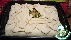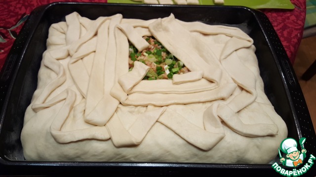 Посыпать начинку зелёным луком. После этого прикрыть боковушки и начать выкладывать полоски теста, закрывая ими верх.