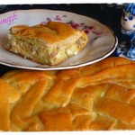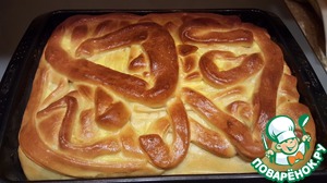 Я выкладывала полоски без определённого рисунка, так что получилось нечто абстрактное. Прогреть духовку до 180 град. Смазать пирог яйцом с молоком и выпекать около 40 минут.