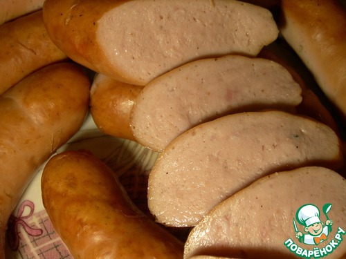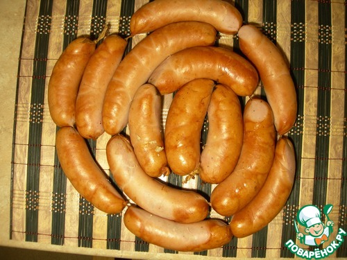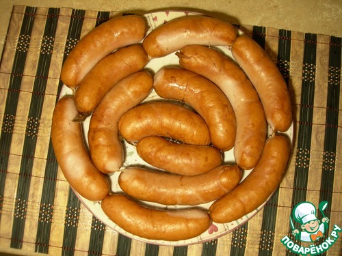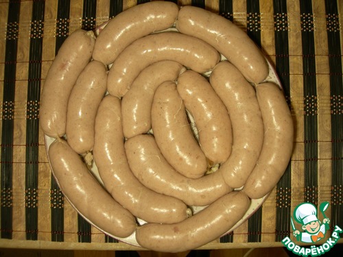 Подготавливаем натуральную оболочку диаметром 30 - 40мм. Набиваем фарш в оболочку формируя сардельки перекручиванием. Набивка чуть более средней плотности, чтоб не рвалась оболочка.
