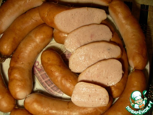 После обжарки сразу же помещаем сардельки в горячую воду 78-85гр С и варим 15-30 минут, до получения 65-68гр с в середине сардельки.