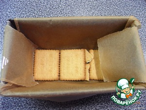 Форму для хлеба выстелить пергаментной бумагой или алюминиевой фольгой, но старайтесь делать поменьше морщин. Нижний слой - печенье, затем слоями: шоколадная масса, печенье и т. д. Верхний слой - шоколадная масса.