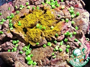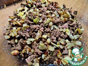 Заполняем дно печёночными кусочками, сверху-обжаренный лук.