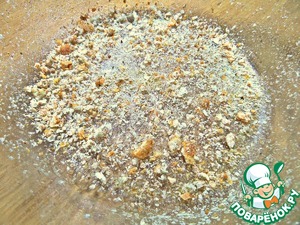 Берём форму ля запекания, смазываем маслом и насыпаем на дно домашние сухари из булки. У меня форма стеклянная, для СВЧ.