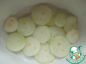 На дно огнеупорной посуды, глубокой, выкладываем порезанный лук.