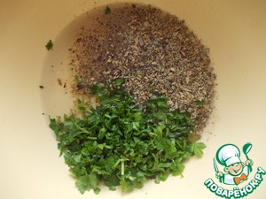 Влить вино, специи и порезать мелко петрушку.