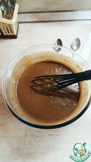 Отдельно: холодный кофе (у меня 1 ч. л. растворимого кофе на 0.5 стакана воды) + растительное масло (без запаха) + кефир + яйца ( крупные 1.5, мелкие 2 шт.). Также перемешиваем венчиком.