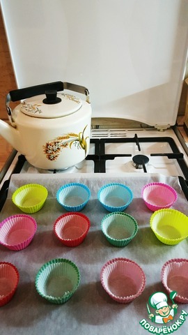 Вот мои силиконовые формочки (нет спец. противня), в каждую положила бумажную формочку и залила тесто (треть формочки). Заливать тесто проще из стаканчика с выемкой. В идеале должно получиться 12 кексиков (у меня получилось 16).