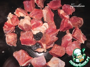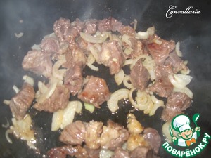 Обжарить мясо до золотисто-коричневого цвета, периодически помешивая. -