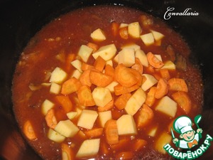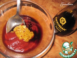 В отдельной емкости смешать томатную пасту, соевый соус, сахар, семена перца, горчицу и воду - добавить к мясу.