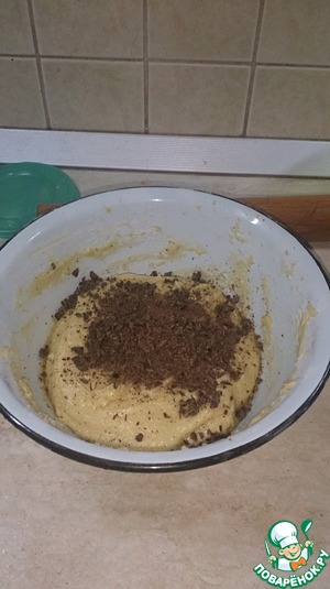 По очереди не прекращая взбивания добавить желток, яйцо, гашенную соду, муку и холодное молоко. Шоколад мелко порубить и все перемешать