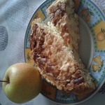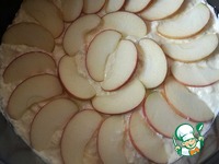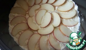 Разравниваем поверхность теста в чаше мультиварки. Оставшееся яблоко режем тонкими ломтиками, предварительно вырезав сердцевину, и укладываем поверх теста в произвольном порядке. У меня так.
