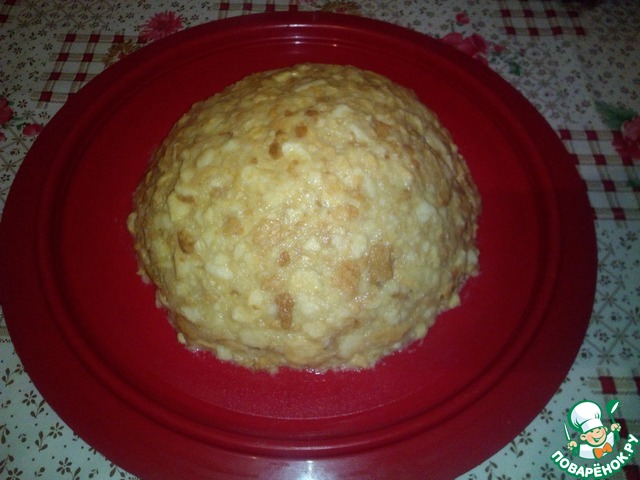 После этого выкладывает руками будущий торт на блюдо, и хорошенько утрамбовывая, формируем горку, после этого смачиваем руки водой, и разглаживаем торт.