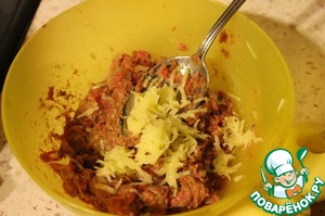 Серединки 2х картофелин натереть на мелкой терке и добавить в фарш. Перемешать.