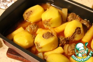 Нафаршировать картофель фаршем и выложить в форму для запекания. Остатки фарша сформировать в виде фрикаделек.
