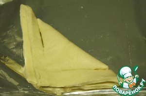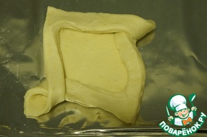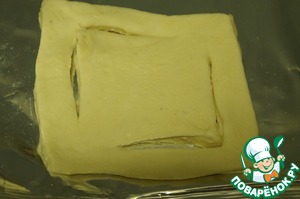 Тесто слегка раскатать в одном направлении, нарезать на квадраты.