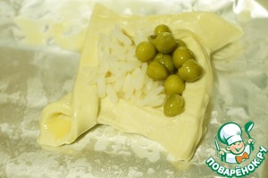 Наполнить пирожки начинкой: выложить немного отварного риса, капнуть майонеза (или сливочного масла, кто как любит), грибы, горошек.