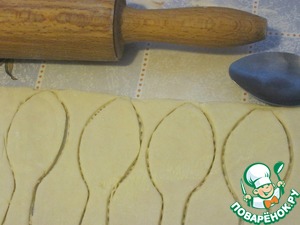 В это время слегка раскатать тесто (в одном направлении). Используя обычную ложку как лекало вырезать ножом из теста заготовки для волованов.