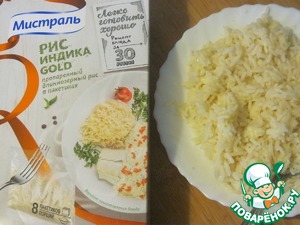 Готовый горячий рис освободить от пакетика, добавить 2 ст. л. тёртого Пармезана, перемешать.