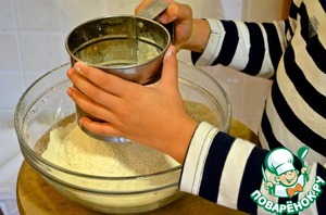 2. Муку просеять, добавить соль, постепенно влить дрожжевую жидкость и размешать, чтобы сформировалось тесто.