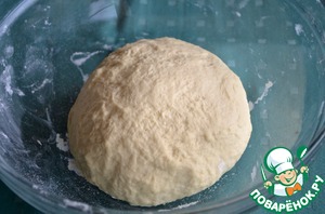 3. Выложить получившееся тесто на рабочую поверхность, посыпанную мукой и вымешивать 10 минут, чтобы оно стало эластичным и нелипким. Убрать тесто в миску, накрыть смазанной оливковом маслом пищевой пленкой (масляной стороной вниз) и оставить подниматься на полтора часа.