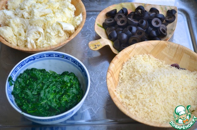 5. Маслины порезать кружочками. Шпинат бланшировать, слить воду, остудить, отжать и порубить. Моцареллу порвать на небольшие кусочки, пармезан мелко натереть.