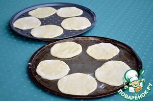 6. Подошедшее тесто еще раз вымесить и разрезать на четыре части. Каждую часть разделить на пять шариков. Раскатать шарики тонко, так при запекании получится золотистая хрустящая пицца, где вкус начинки более ярко выражен, чем вкус хлеба. Раскатывать лучше не на муке, а на манке или мелкой кукурузной крупе, так тесто получается более воздушным или хрустящим.