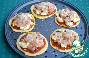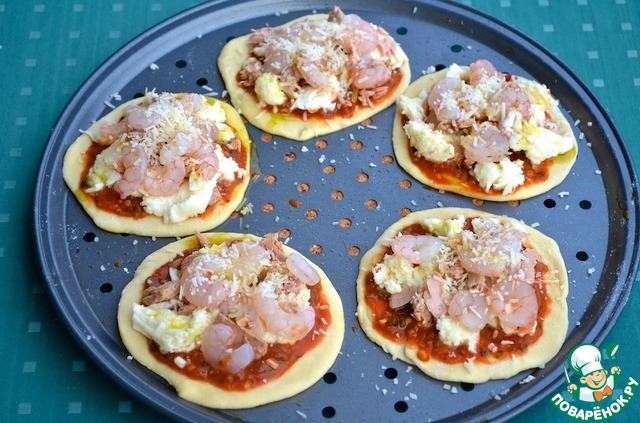 7. Выложить кружочки теста на противни и смазать томатным соусом. На рыбные пиццетты выложить тунец и креветки и присыпать пармезаном.