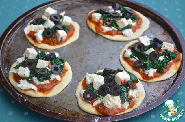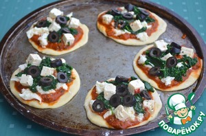 8. На овощные пиццетты поверх томатного соуса выложить моцареллу, шпинат, маслины и фету.