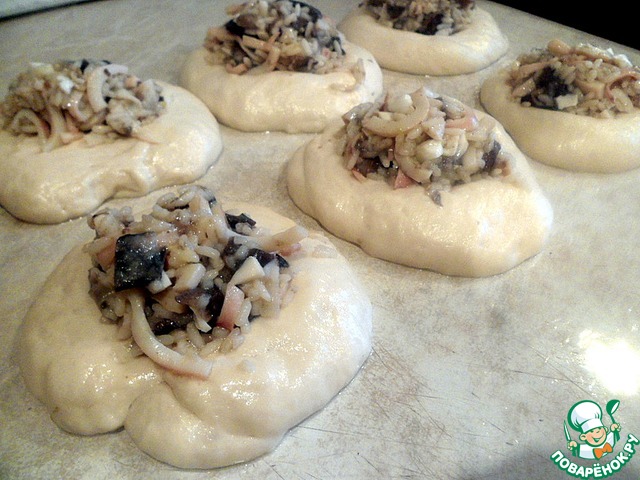 Поверхность стола и руки смазать растительным маслом, выложить тесто и сформировать небольшие лепешки. Муку не применяем. Сверху на них выложить по столовой ложке начинки.