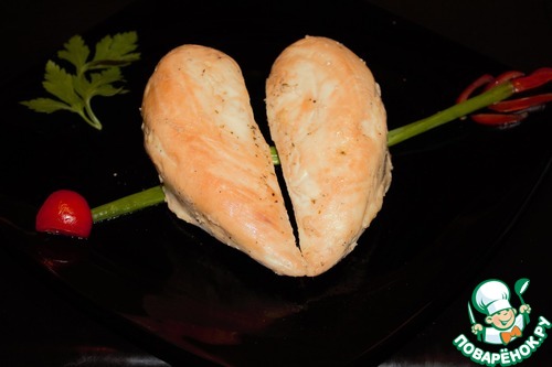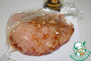 Куриную грудку помыть, просушить бумажным полотенцем, поместить в рукав для запекания, залить маринадом, завязать рукав и немного потрясти, что бы маринад равномерно распределился и убрать в холодильник минимум на 40 минут (подготовленное таким образом мясо можно оставить и на ночь). Поместить куриную грудку в пароварку и варить на пару 30-40 минут.