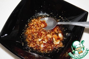 Приготовим маринад. В небольшой миске смешать соевый соус, мелко порезанный чеснок, лимонный сок и оливковое масло.