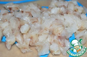 Рыбу режем мелкими кусочками. Подойдет любая морская рыба, у меня конгрио.