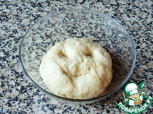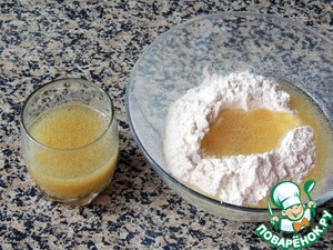 Муку высыпать в большую миску. Смешать жидкие составляющие и влить в муку.