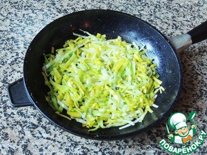 Для начинки светлую часть лука-порея порезать полукольцами. Шампиньоны нарезать тонкими пластинками.
